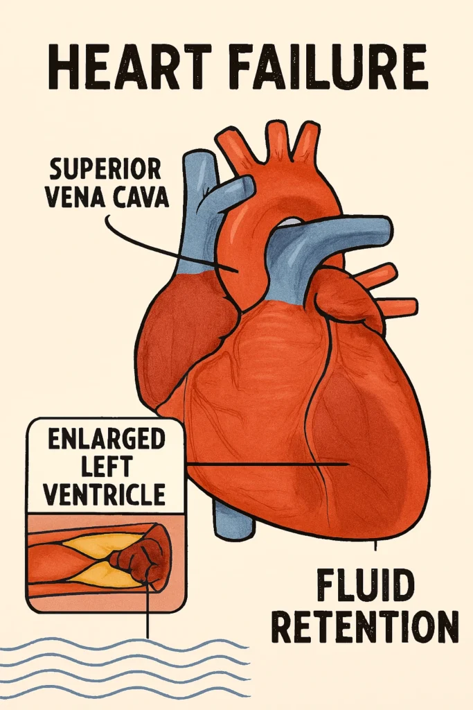 - Congestive heart failure (CHF) – when fluid builds up in the lungs and other parts of the body due to poor pumping.