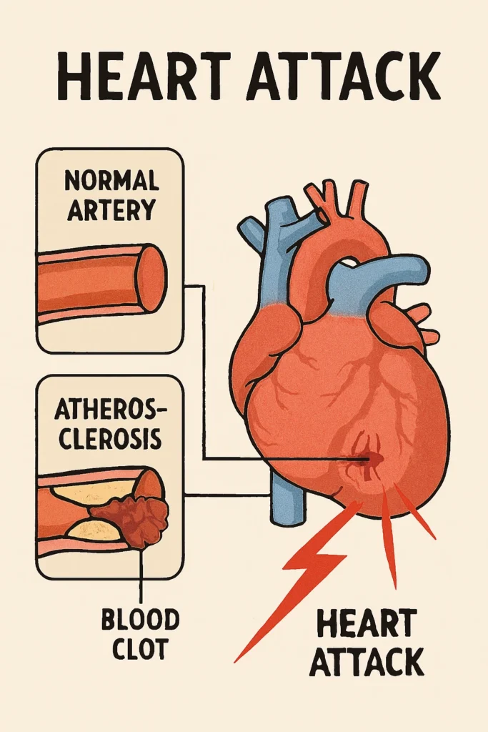 A heart attack, medically known as a myocardial infarction (MI), occurs when blood flow to a part of the heart is blocked. This usually happens because of a buildup of plaque (fat, cholesterol, and other substances) in the coronary arteries. When the blockage prevents oxygen-rich blood from reaching the heart muscle, that section of the heart begins to die.
